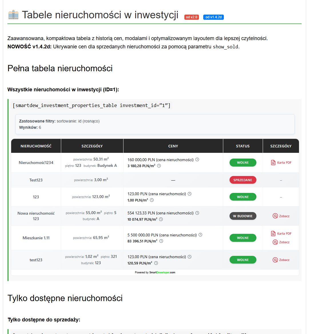 SmartDeweloper.com został zaprojektowany tak, aby maksymalnie ułatwić pracę agencjom reklamowym i web developerom, którzy tworzą strony internetowe dla firm deweloperskich. Zamiast budować rozbudowane tabele, filtry czy listy mieszkań od zera — mogą Państwo użyć jednego z gotowych shortcode’ów, który automatycznie generuje całą strukturę danych z pełnym filtrowaniem i sortowaniem.